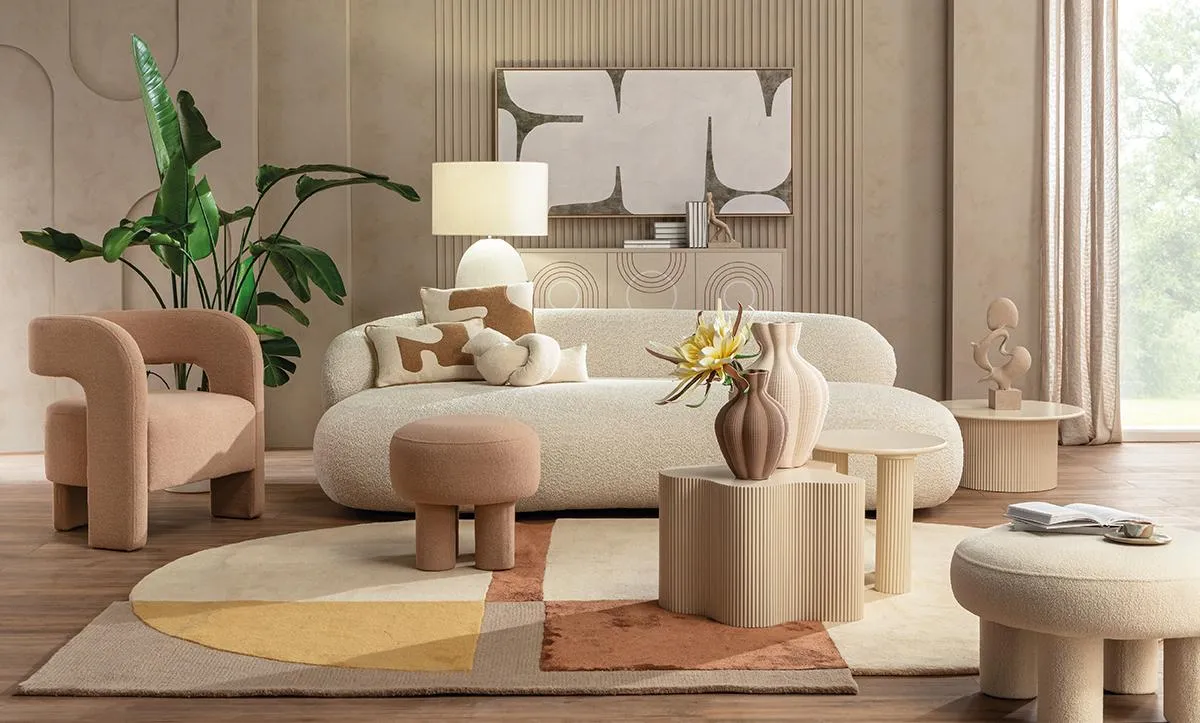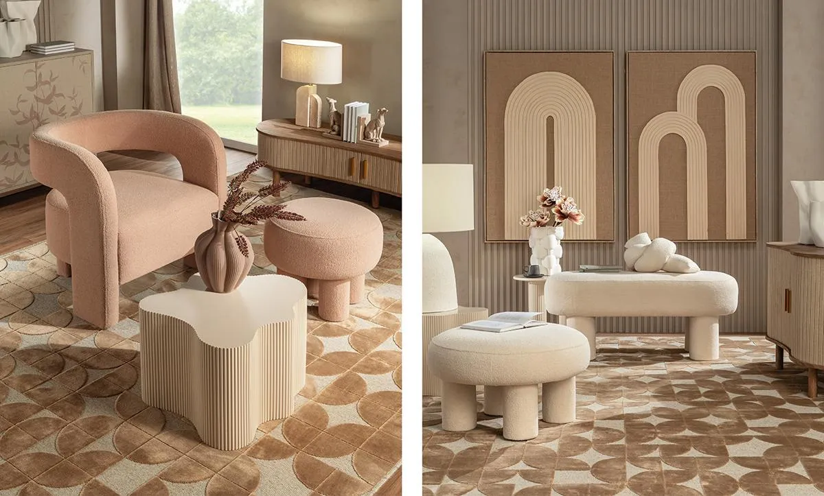 Questa estetica si traduce in un connubio di materiali pregiati, finiture ricercate e tonalità sofisticate: superfici in gesso, pietra calcarea e tessuti bouclé accentuano la matericità delle forme, mentre inserti in ottone spazzolato e ceramica lavorata aggiungono un tocco di brillantezza e tradizione artigianale; il calore naturale delle neutralità terrose si prestano a valorizzare i dettagli di arredi scultorei, tavolini materici e sedute avvolgenti.