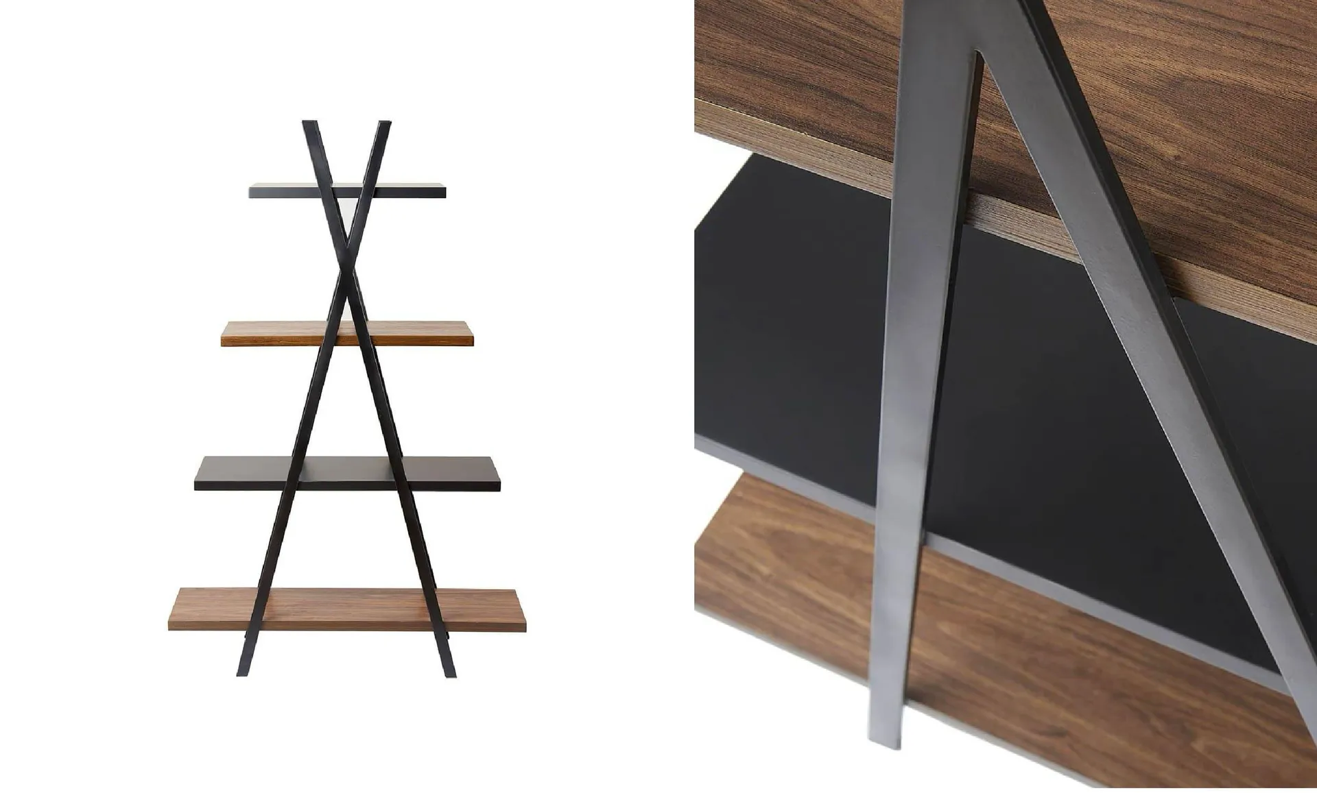 - la libreria a ripiani irregolari rompe le linee classiche con la sua struttura aritmica e dinamica; un pezzo audace che non teme di essere protagonista.