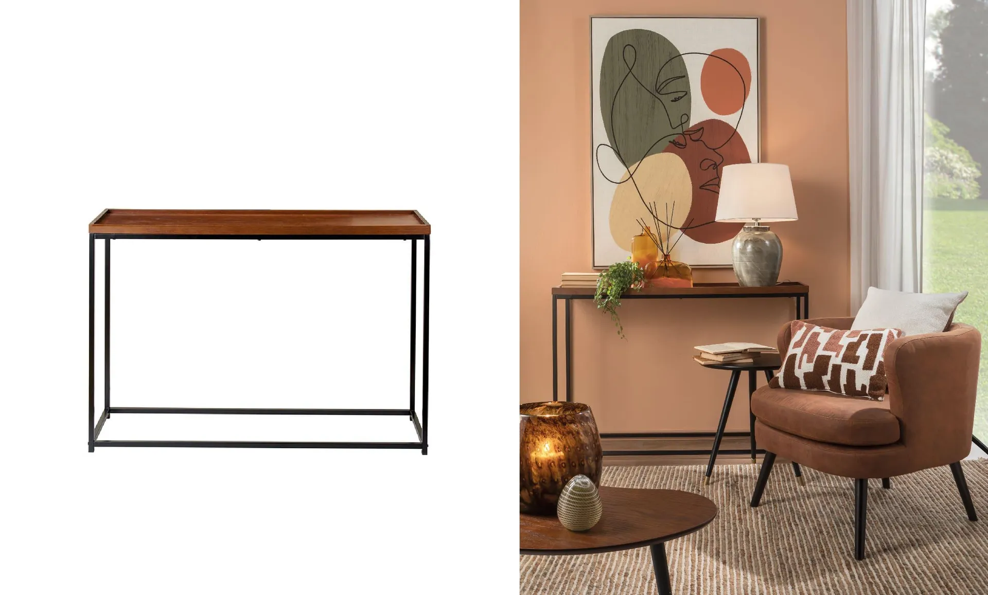 Questa consolle con struttura in metallo nero e piano con finitura legno può esserne un esempio. Le sue linee essenziali dialogano tra loro grazie alla semplicità delle gambe in metallo che fanno apparire il piano quasi come fosse sospeso, sorprendendo per l’effetto di leggerezza abbinato alla nobile matericità del legno.