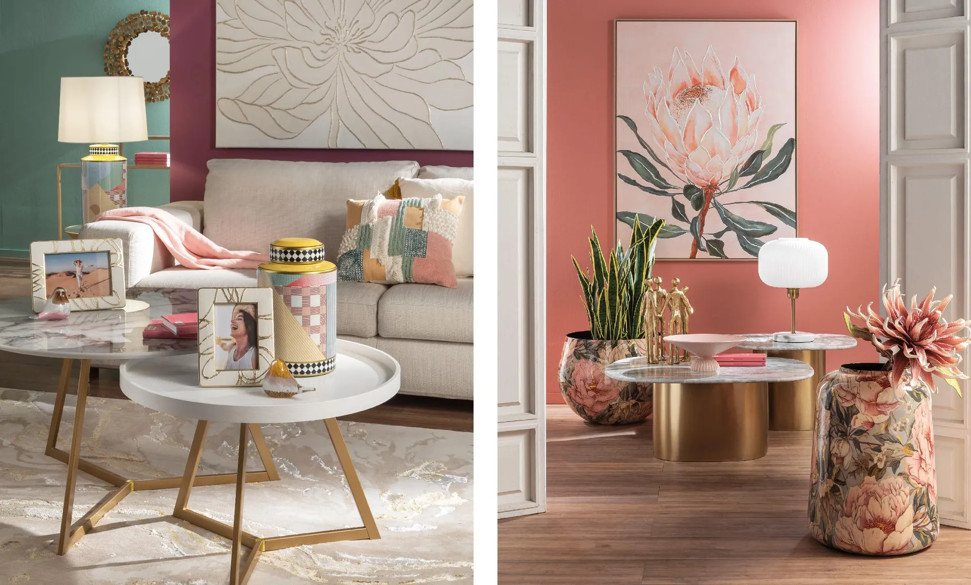 Oppure optare per il “contro-canto”: metallo brunito su divano crema, marmo venato vicino a un bouclé, una resina lucida che introduce una scintilla contemporanea.