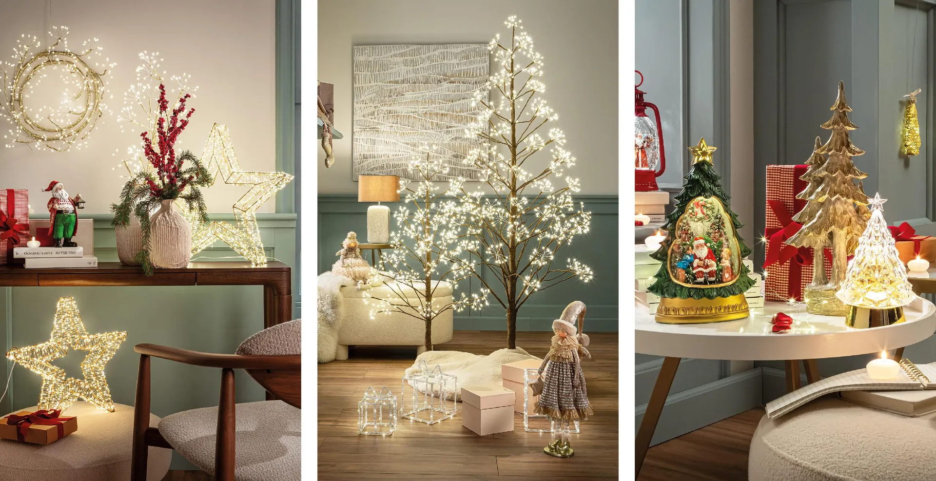 Si può puntare su composizioni di rami, disposte elegantemente in vasi di vetro o ceramica, arricchite con luci a LED e piccole decorazioni. Un’altra soluzione chic è scegliere “alberi di luce” per creare un effetto scenografico che cattura immediatamente lo spirito delle feste. Per un tocco più minimal, si possono usare piccole decorazioni luminose distribuite strategicamente per illuminare gli spazi con un’atmosfera calda e avvolgente.