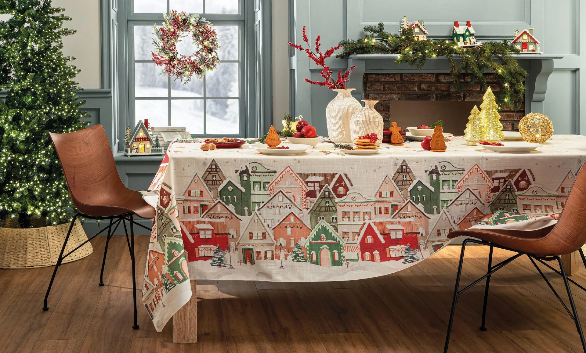 Per un look più giocoso e nostalgico, il tavolo può essere arricchito con un piccolo villaggio natalizio illuminato, con casette finemente decorate che sembrano uscite da una fiaba o con simpatici potiche. Queste creazioni evocano un senso di meraviglia e riportano alla mente la magia dell’infanzia. Perfette per sorprendere grandi e piccoli.