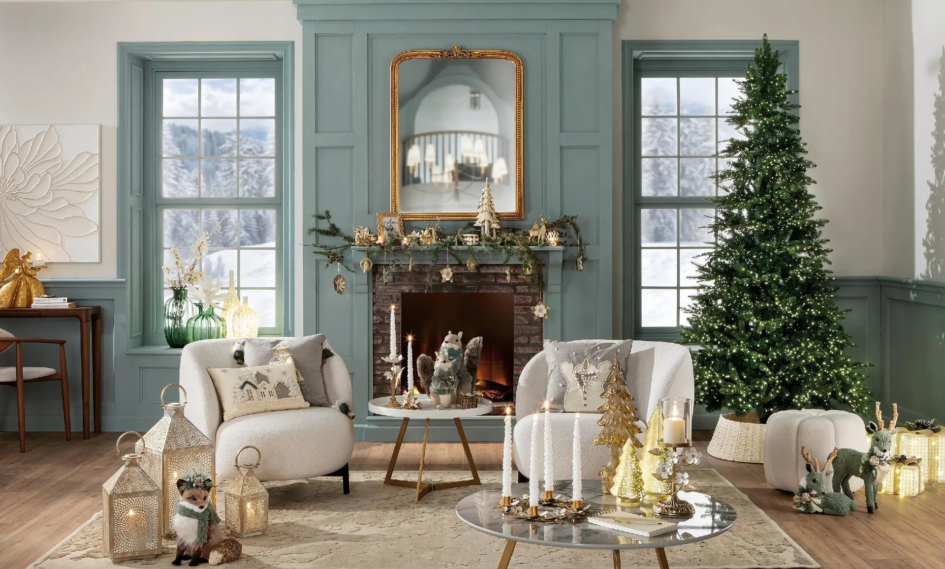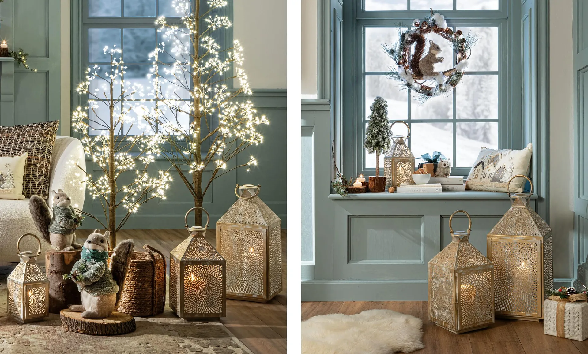 A terra, un set di lanterne in metallo dorato, al cui interno brillano candele tremolanti, per creare un gioco di luci che avvolge in un caldo abbraccio che sussurra “Benvenuto nella magia delle feste”.