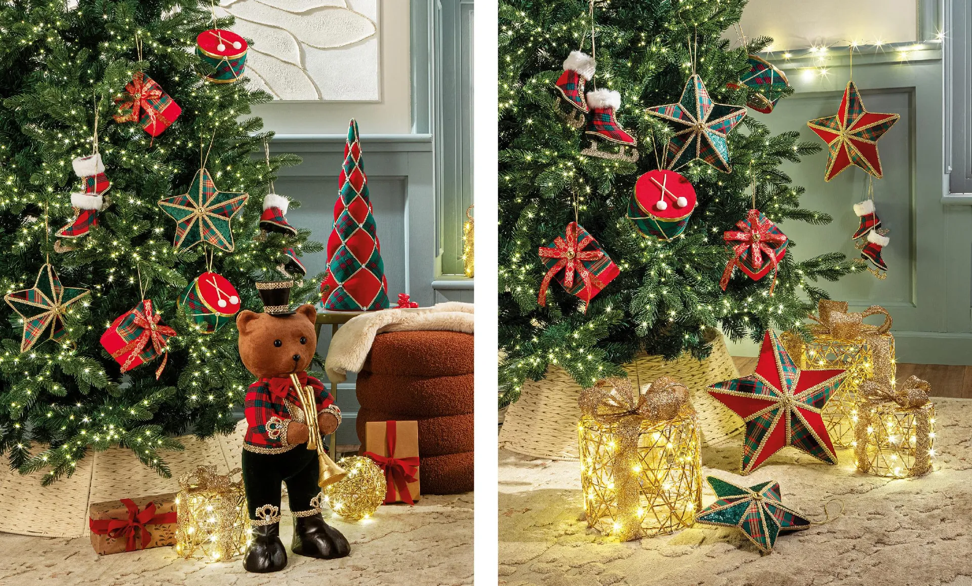 - Per chi ama l’atmosfera di una casa di campagna immersa nella neve, lo stile tartan è perfetto per raccontare un Natale che è un sofisticato ritorno alle origini. Un albero adornato con stelle, pacchetti regalo e pattini da ghiaccio, tutti avvolti nei classici motivi scozzesi; il rosso intenso e il verde bosco che si incontrano con dettagli dorati: ecco il perfetto equilibrio tra tradizione e modernità.