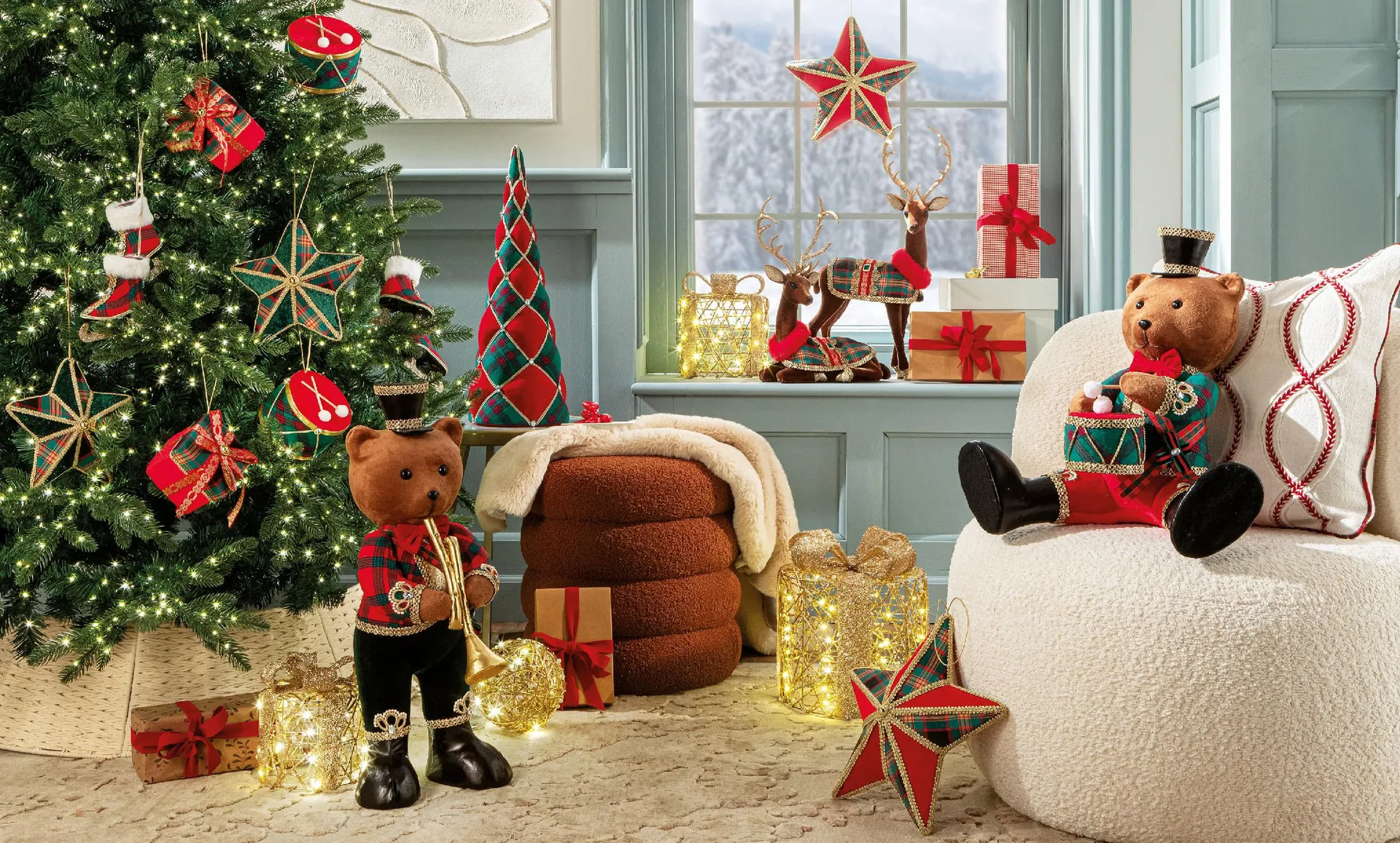 Per realizzarlo bastano pochi elementi chiave: morbidi orsetti vestiti da soldatini, renne elegantemente rivestite, alberi in tessuto e qualche pacchetto luminoso. E voilà: il living è pronto per raccontare una storia di tradizione reinterpretata con gusto moderno.