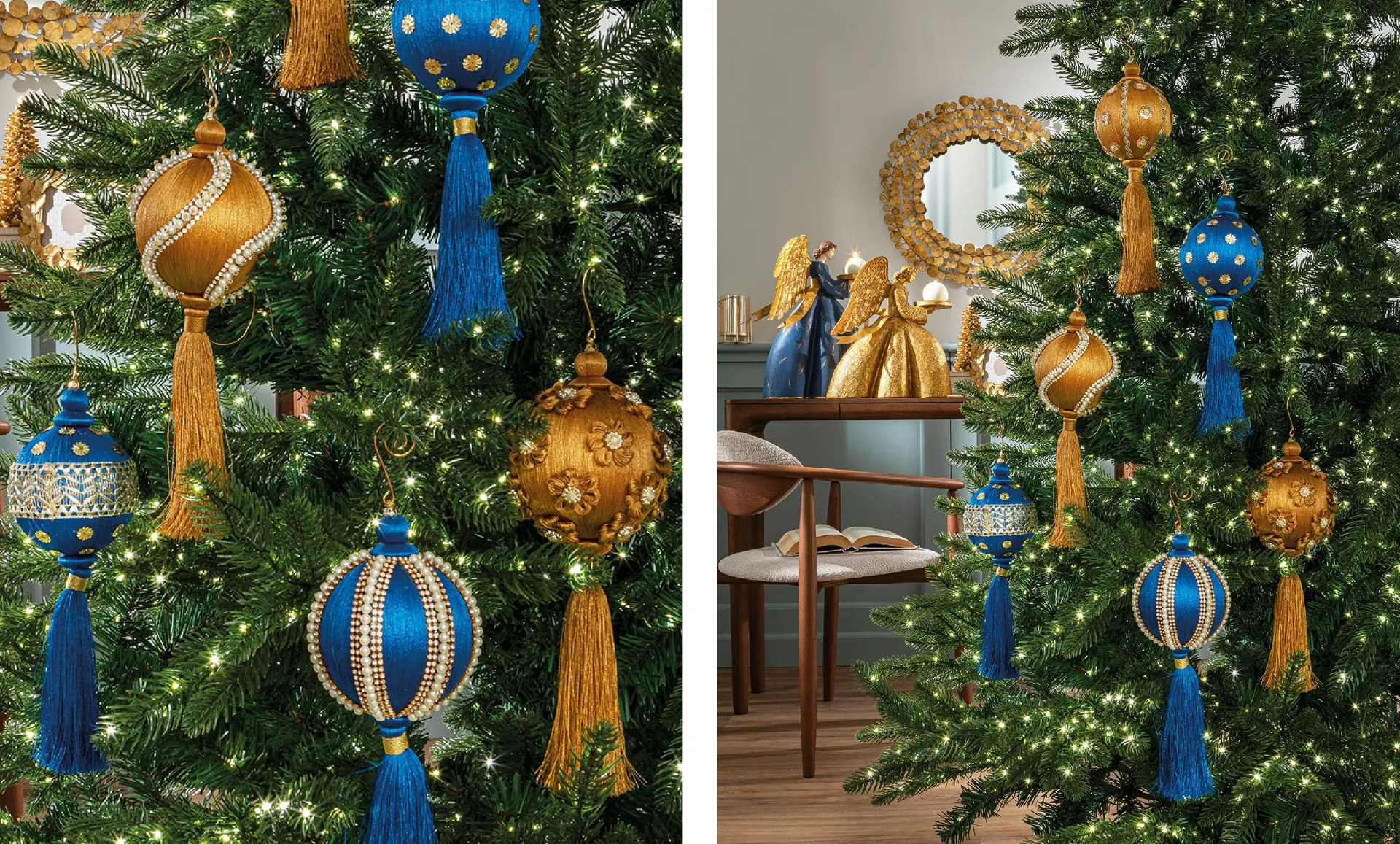 - Per chi desidera un albero che parli di raffinatezza, il tema blu e oro è d’obbligo. E per realizzarlo non c’è niente di meglio che la maestosità di palline ornate con dettagli dorati e nappine in seta. Per trasformare il Natale in un momento da celebrare con eleganza assoluta.