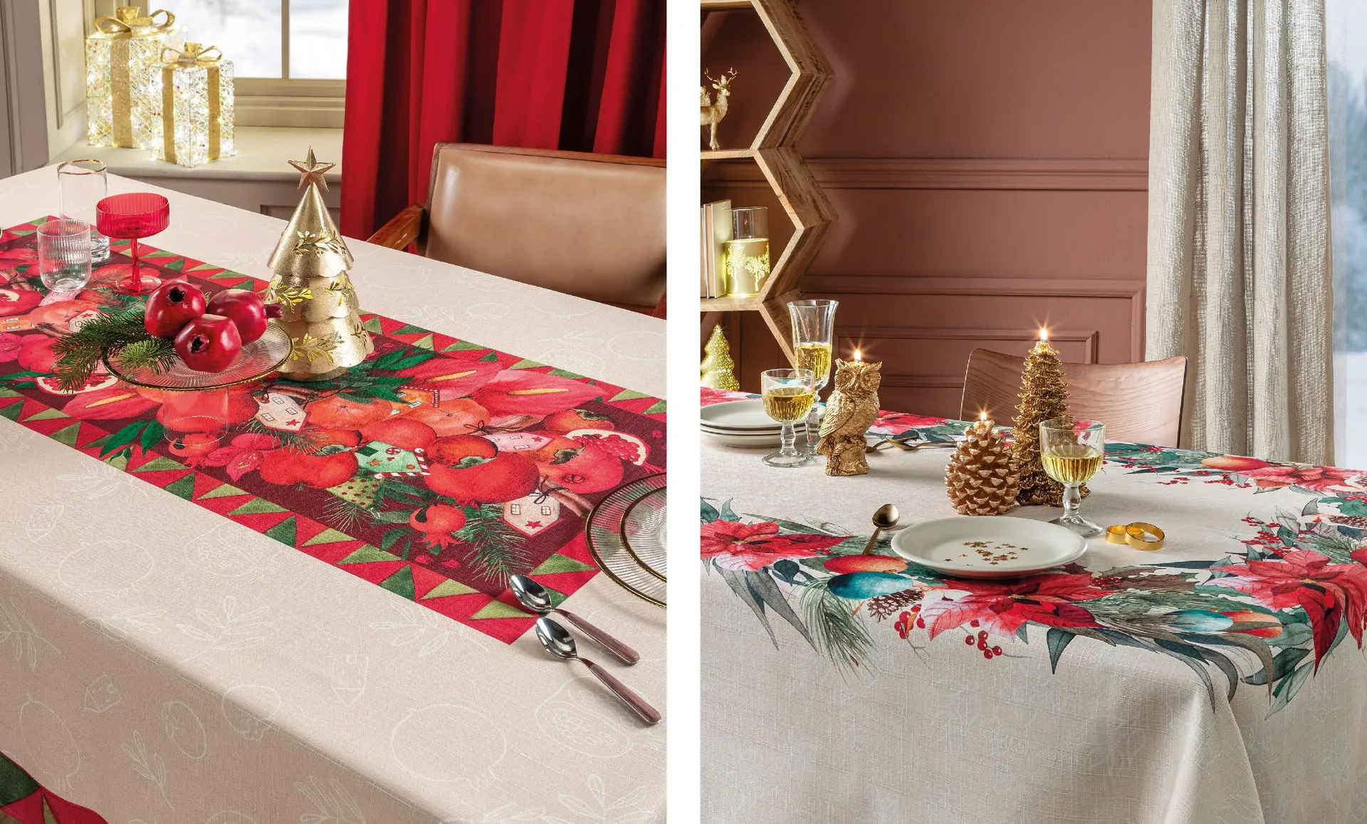 Per tavole di Natale più eleganti e sofisticate si affermano bordure floreali e ghirlande stilizzate, distribuite secondo logiche di simmetria o ritmo modulare. In questi casi, la tovaglia lavora per cornici, accompagnando il gesto dell’apparecchiare con discrezione, senza invadere il centro del tavolo.