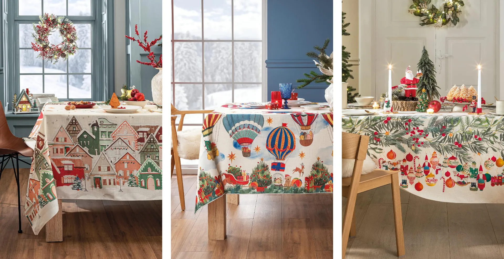Le versioni stampate prediligono un registro illustrativo e grafico: villaggi innevati, mongolfiere, botaniche festive. Temi riconoscibili, ma trattati con leggerezza e senso della composizione. Ideali per ambienti dal tono narrativo, ma anche per alleggerire contesti più formali, introducendo un accento giocoso, calibrato nei volumi e nei colori.