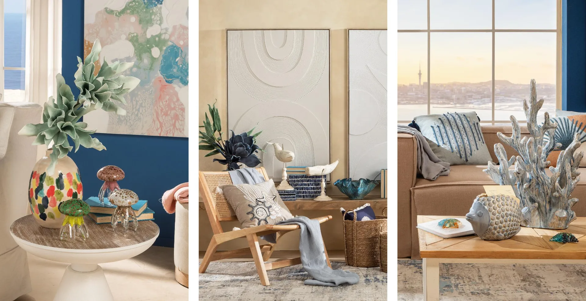 - Le decorazioni in vetro, legno e ceramica possono diventare piccole architetture domestiche. I vetri colorati, che richiamano creature marine stilizzate o meduse fluttuanti, introducono una nota artistica e quasi onirica. Il legno lavorato, levigato e reinterpretato in chiave scultorea, porta invece un senso di radicamento e naturalità, evocando i frammenti restituiti dal mare; oggetti come la scultura a forma di corallo, dal forte impatto materico, o il pesce decorativo in ceramica smaltata, trasformano un semplice piano d’appoggio in una piccola installazione domestica, portando con sé suggestioni marine capaci di arricchire visivamente l’ambiente senza interromperne l’armonia.