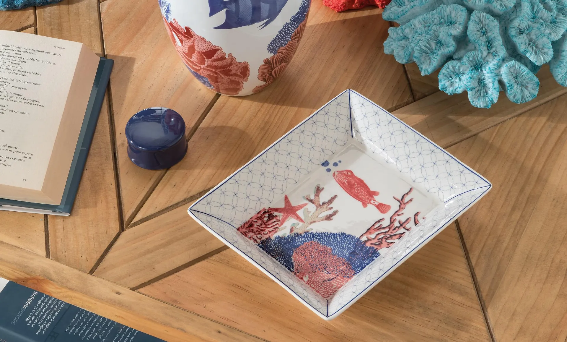 - Gli svuotatasche in ceramica decorata sono accessori funzionali, sì, ma anche frammenti di racconto, capaci di legare estetica e quotidianità. Posizionati su un tavolino, una consolle o una mensola d’ingresso, si trasformano in “gesti di accoglienza”. È la semplicità dei dettagli a evocare il silenzio prezioso della vita in fondo al mare.