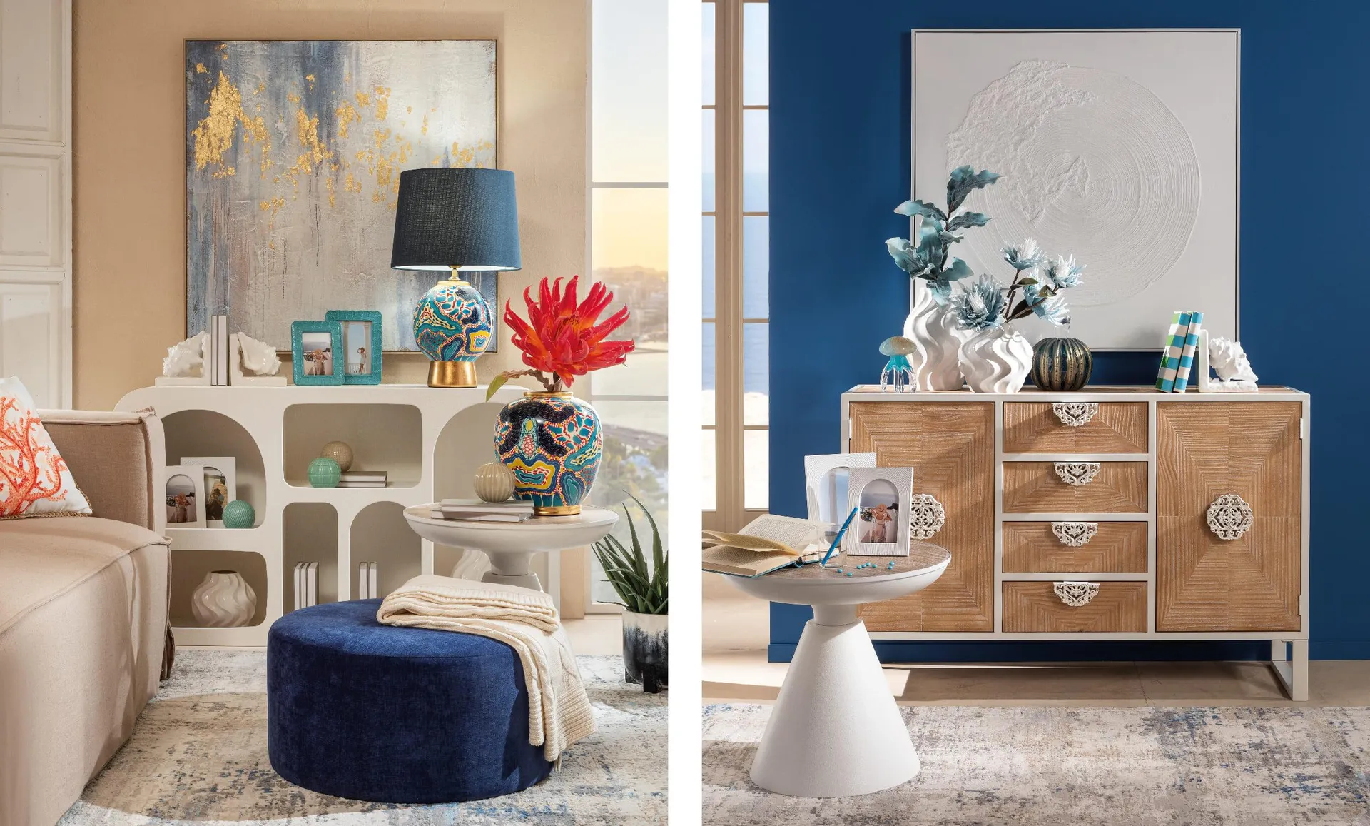 Oggetti decorativi dalle linee organiche, morbide e irregolari — come vasi che sembrano levigati dal vento o lampade che richiamano la fluidità dell’acqua — conferiscono dinamismo e poesia allo spazio.
