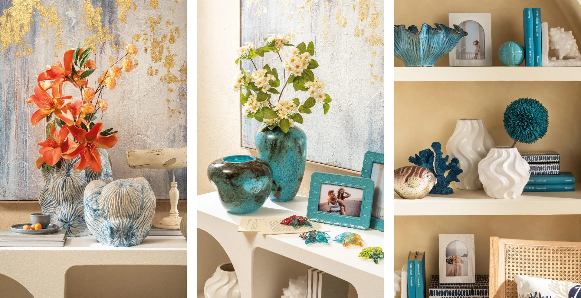 Altro elemento fondamentale nel realizzare una decorazione a tema marino sono i vasi in ceramica e vetro: oggetti-scultura che, pur nella loro essenzialità, diventano immediatamente protagonisti dello spazio.