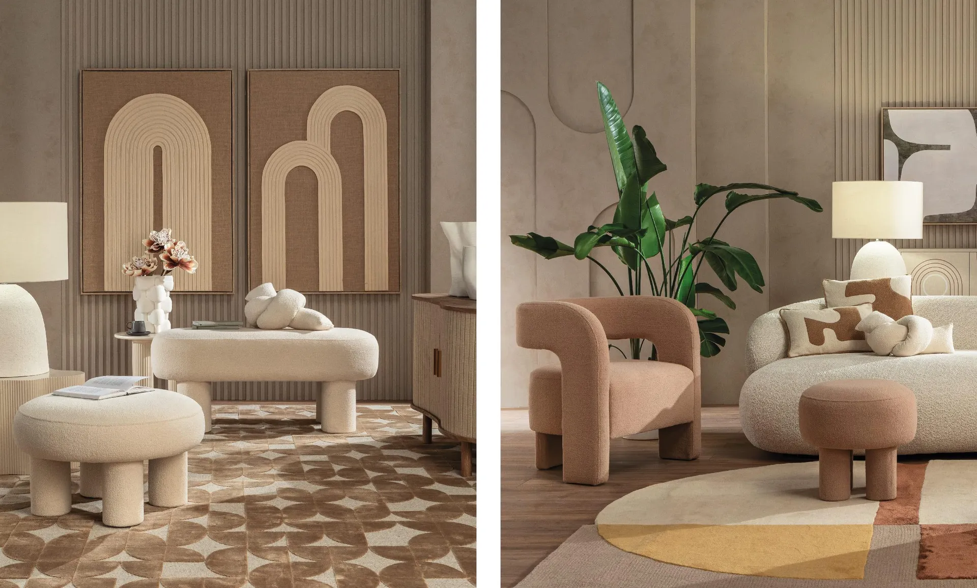 Poltroncine e pouf diventano elementi scultorei e funzionali allo stesso tempo, pezzi che evocano la purezza del design classico reinterpretato in una chiave di assoluto comfort contemporaneo. Le linee arrotondate, prive di spigoli, creano una sensazione di equilibrio e fluidità, come se ogni elemento fosse stato levigato dal tempo.