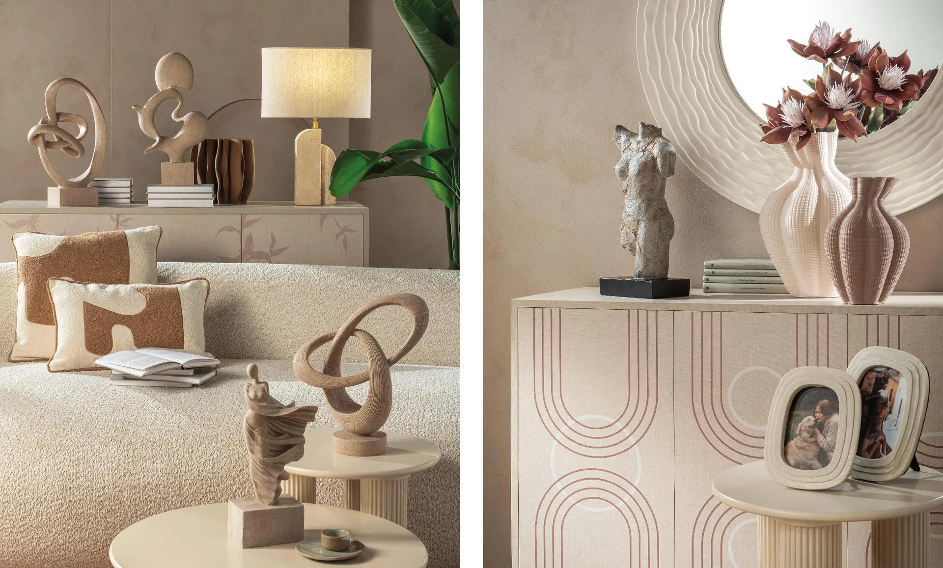 Le silhouette degli oggetti decorativi proposti si muovono tra due dimensioni estetiche: da un lato, la fluidità delle forme astratte e dinamiche, fatte di intrecci armoniosi e movimenti sinuosi; dall’altro, la solennità della statuaria classica, con busti frammentati e corpi che sembrano emergere dal passato per abitare il presente.