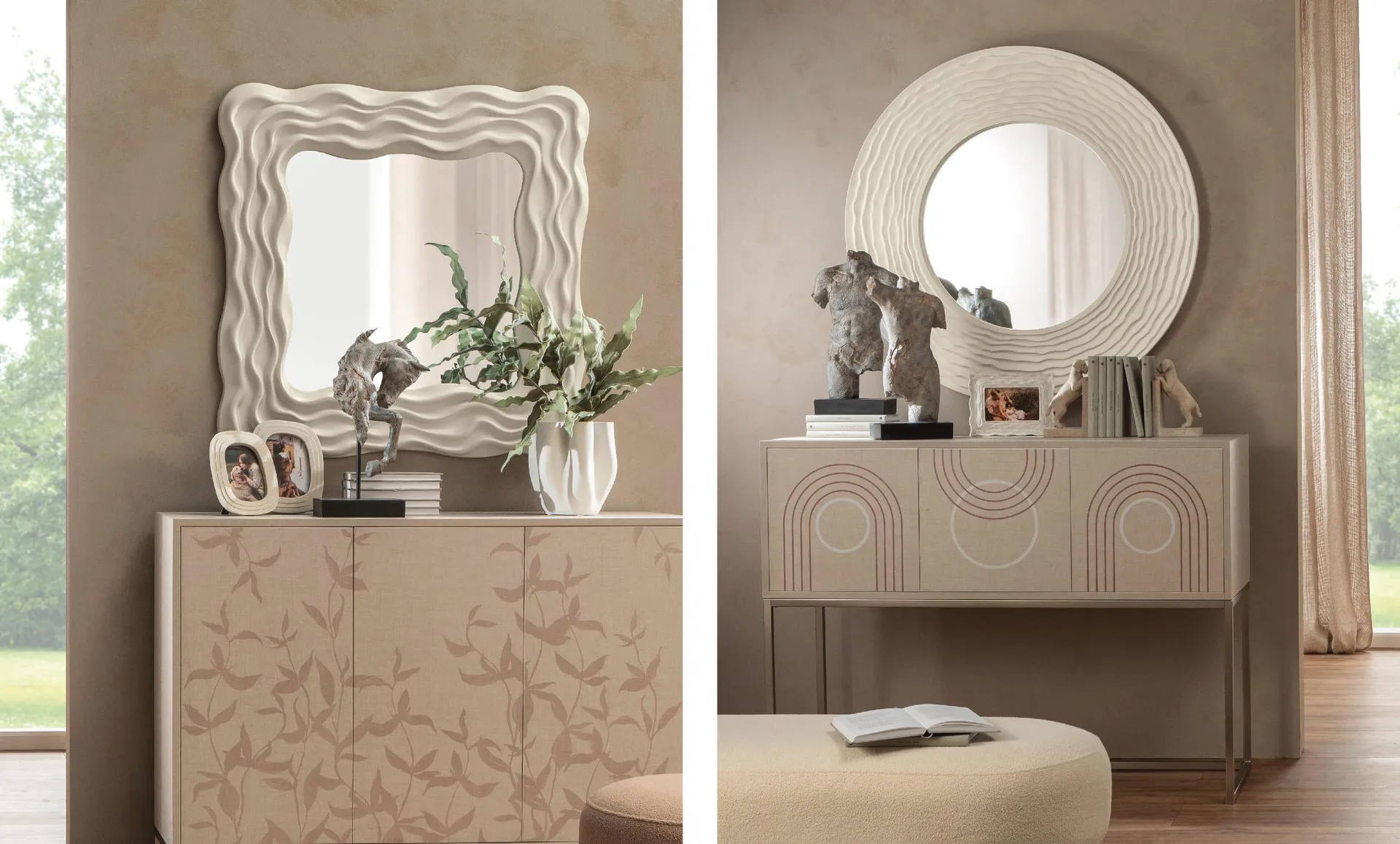 Gli specchi, dalle forme scultoree e dai profili fluidi, evocano la morbidezza del marmo levigato e la raffinatezza degli stucchi classici, ma con un linguaggio estetico più leggero e contemporaneo. Il loro movimento ondulato e le texture delicate sembrano quasi voler scolpire la luce, creando un effetto vibrante e sofisticato.