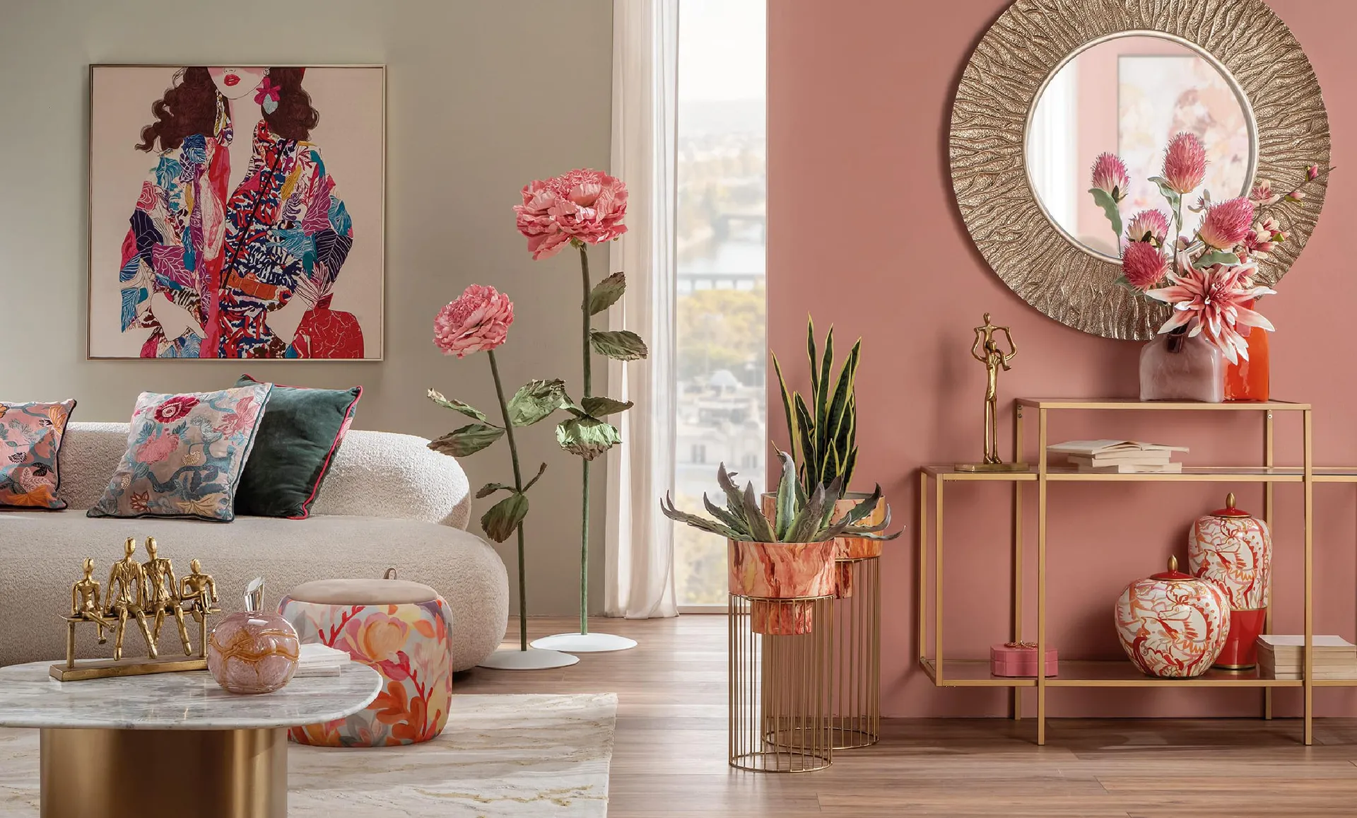 A parete, un grande quadro raffigurante una figura femminile stilizzata diventa elemento narrativo: una presenza quasi iconica, simbolo del legame tra moda e interior. Al suo fianco, fiori decorativi oversize in tonalità rosa antico e corallo richiamano le stampe dei tessuti, creando un filo conduttore tra arte, arredo e decorazione.