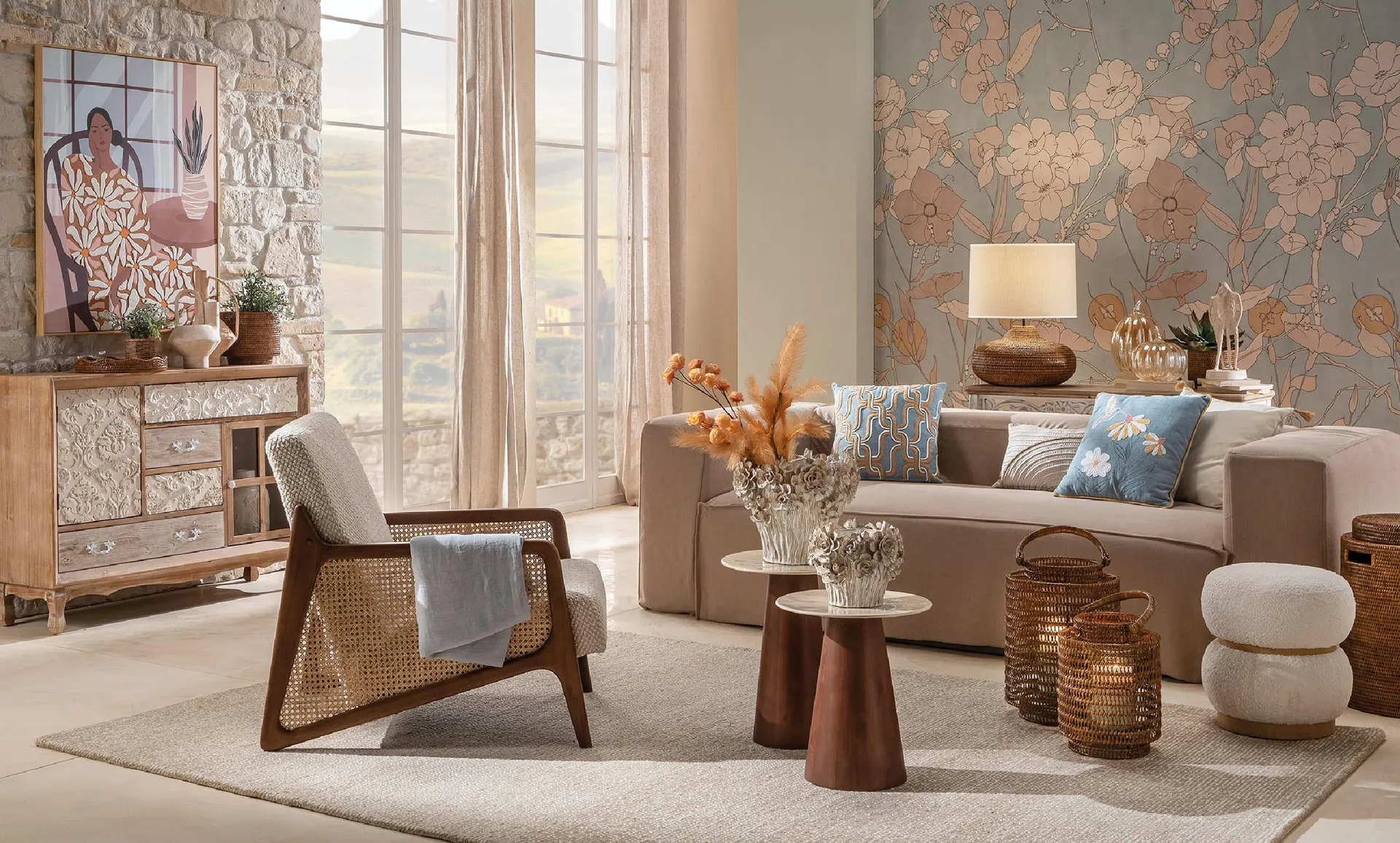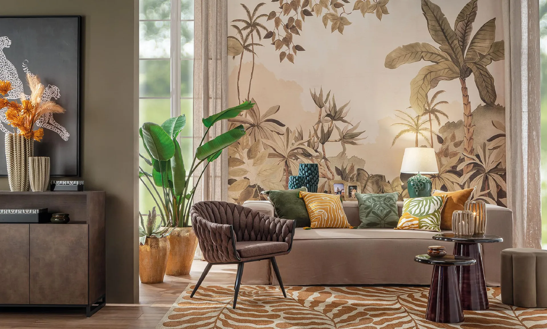 L’ambiente racconta una natura tropicale, ma filtrata da una palette elegante e calda: beige cipriati, verdi intensi, ocra speziati e note di terracotta si rincorrono su tessuti e accessori, creando una trama narrativa materica. Il cuore visivo dello spazio è la grande parete decorata con la carta da parati, che si apre come un affresco botanico in toni soft, evocando giardini lontani, miti equatoriali e lentezze mediterranee.