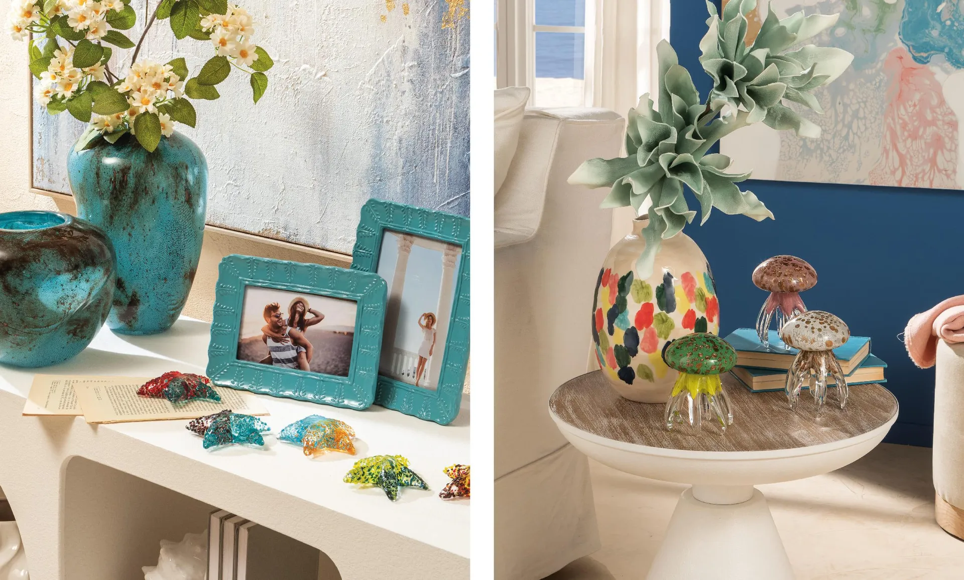 Non è necessario esagerare: bastano pochi pezzi, scelti con cura, disposti con attenzione. Come alcune piccole sculture in vetro che ricordano stelle marine e meduse, appoggiate come se fossero appena emerse dal fondo sabbioso.
