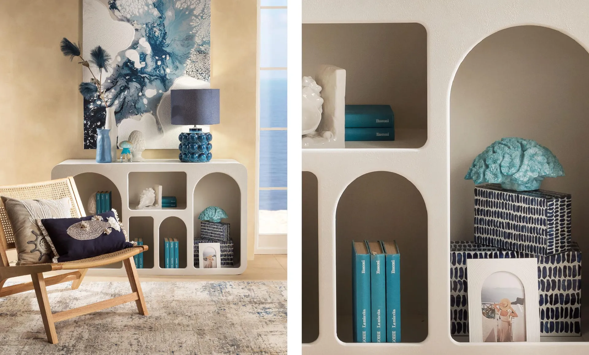Una consolle, ad esempio, può diventare una micro-architettura domestica progettata per creare ritmo, p****ause, pieni e vuoti. Come in questo mobile bianco, scavato da arcate morbide come aperture moresche, che è quasi una scultura abitabile. È al tempo stesso contenitore, sfondo e soggetto. Al suo interno non si depositano semplicemente oggetti, ma si compone una narrazione domestica: libri, foto, artefatti marini...