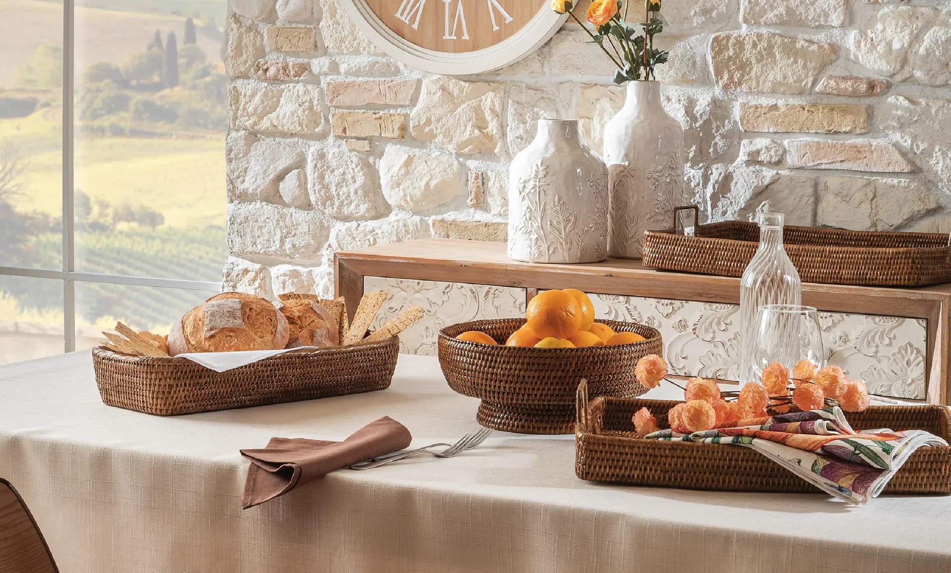 Nel dining design, i cestini e i vassoi in rattan diventano elementi che sanno orchestrare l’ordine con eleganza e discrezione. Le trame intrecciate disegnano superfici che catturano la luce, creando giochi di texture che li rendono non solo semplici contenitori, ma anche dettagli eleganti che aggiungono ritmo e carattere alla tavola.
