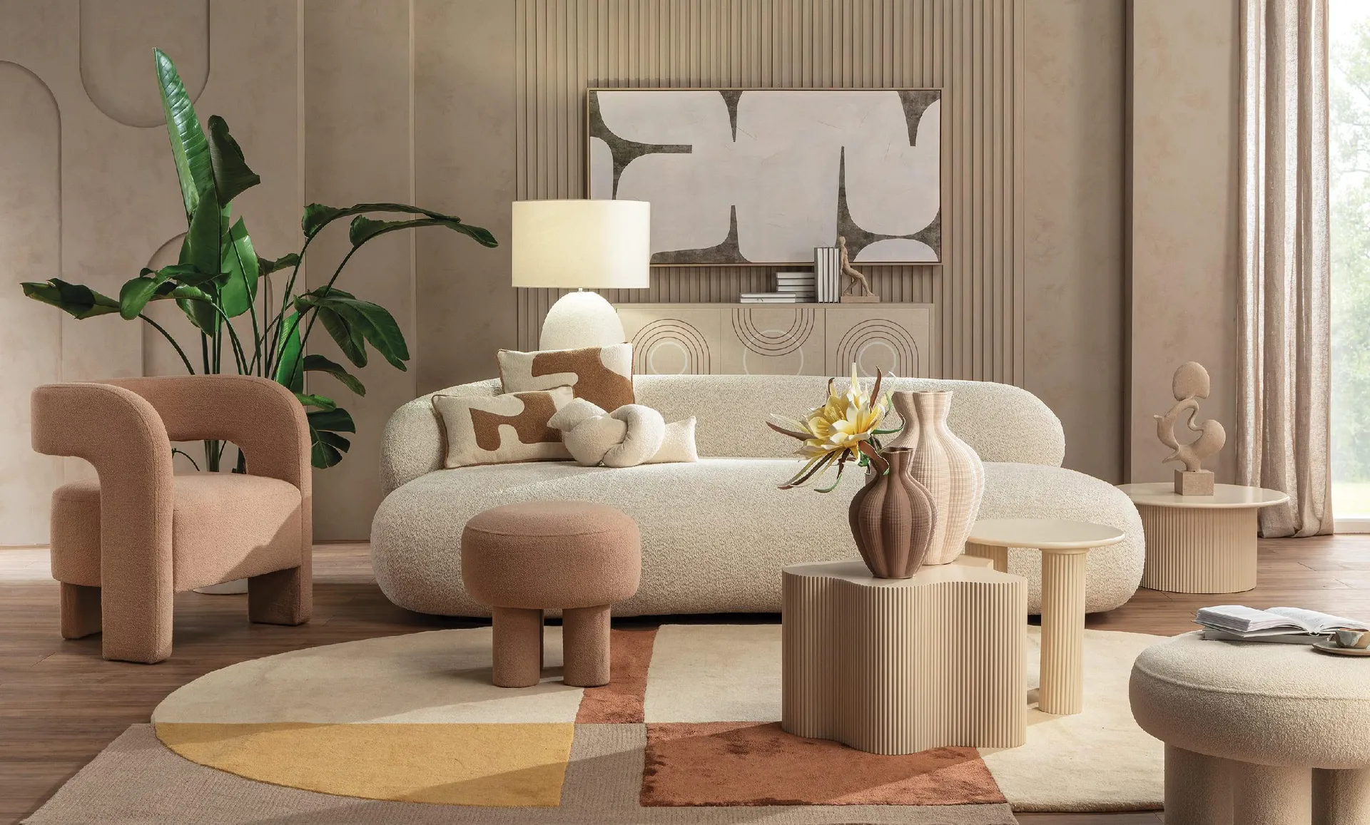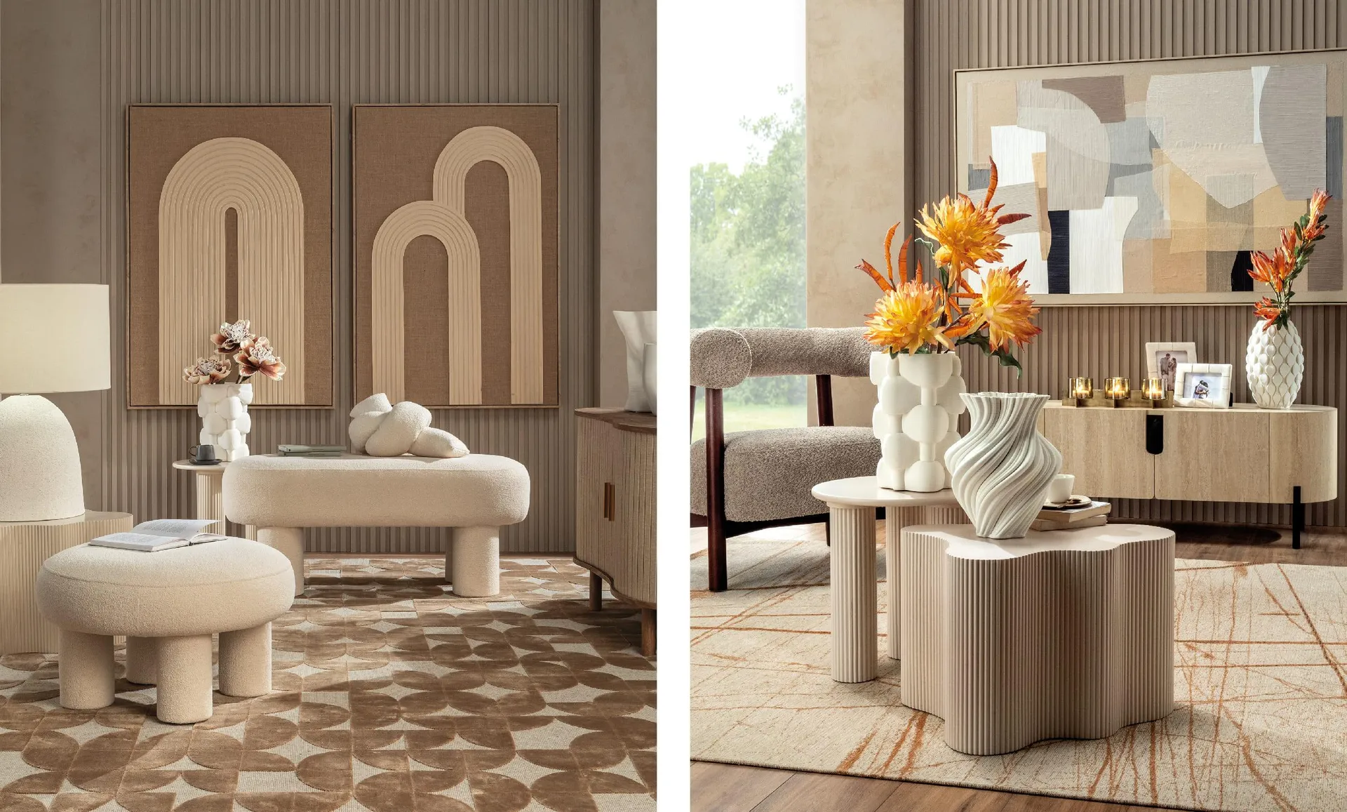 La nuance** si integra perfettamente anche in sculture decorative e vasi in gesso ceramico, dal profilo organico o brutalista, che vestono gli spazi con un’eleganza silenziosa.