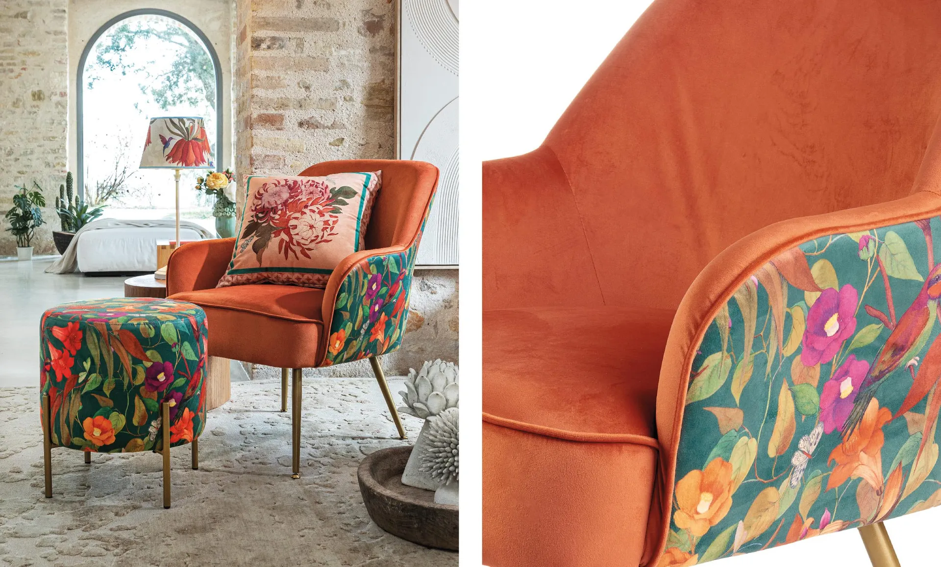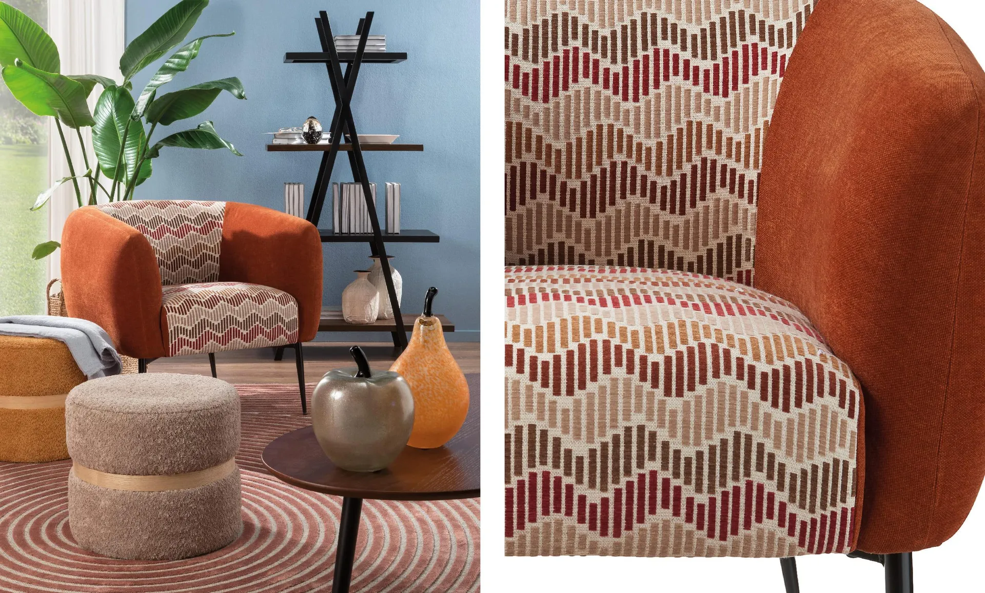 Un’icona di questo stile è la poltroncina in bouclé arancione, con profili arrotondati e dettagli geometrici ispirati agli anni ’60. Le gambe affusolate in metallo nero ne esaltano la leggerezza visiva, mentre il tessuto bouclé aggiunge profondità tattile.