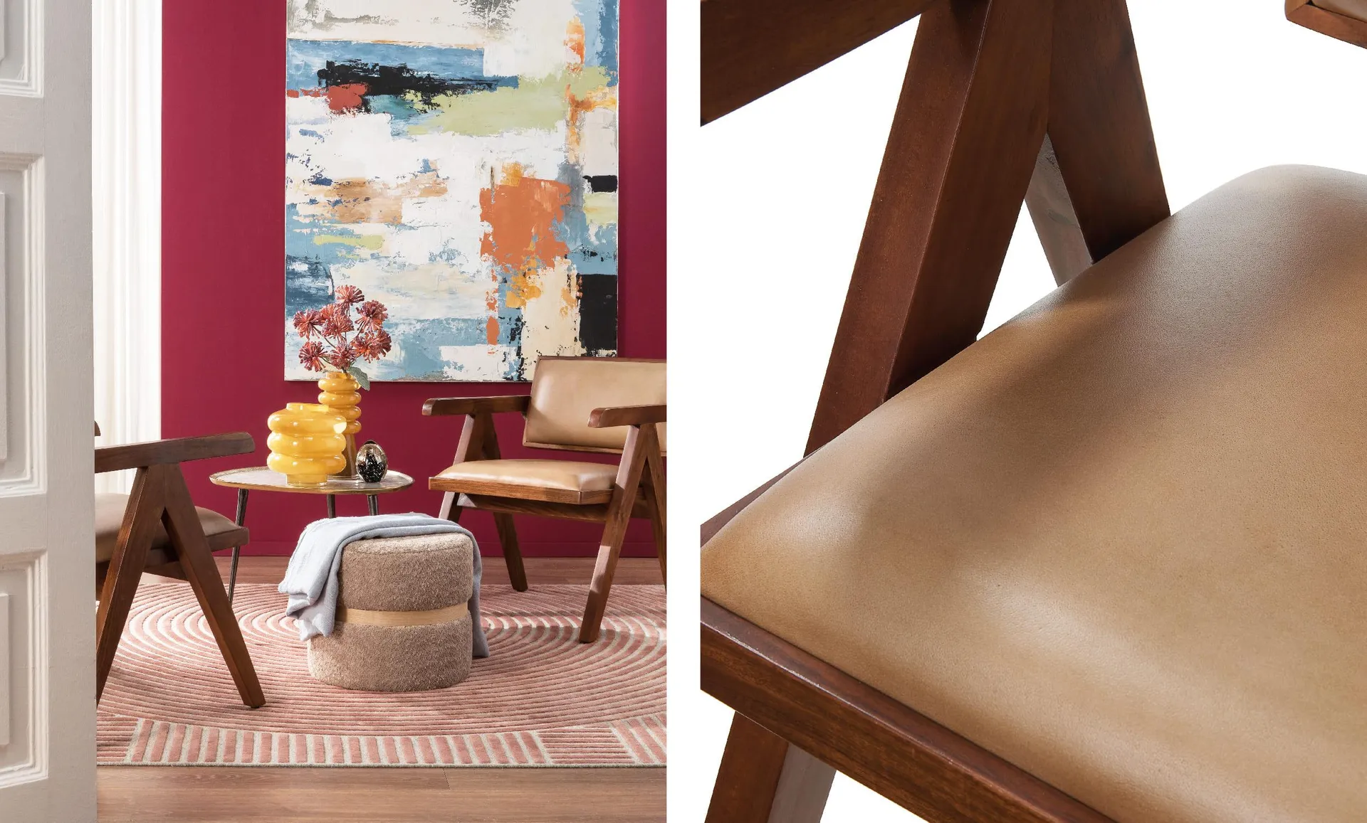 In equilibrio tra rigore geometrico e morbidezza visiva, le poltroncine in legno con rivestimento in pelle sono un omaggio al design mid-century, reinterpretato con uno sguardo attuale.