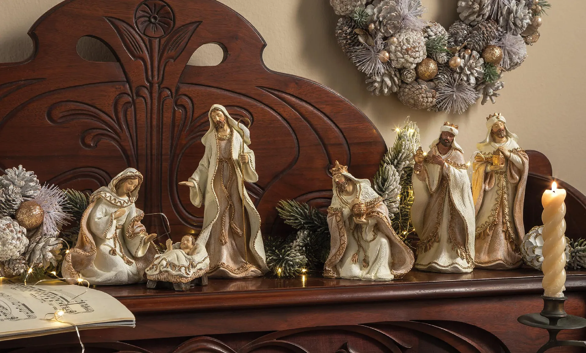 Posizionati su una base in pietra, i tre personaggi principali catturano lo sguardo con la loro semplicità e grazia. Perfetti se accompagnati da un’illuminazione delicata e un uso sapiente di candele e punti luce che possano aggiungere un tocco moderno senza compromettere l’atmosfera classica.