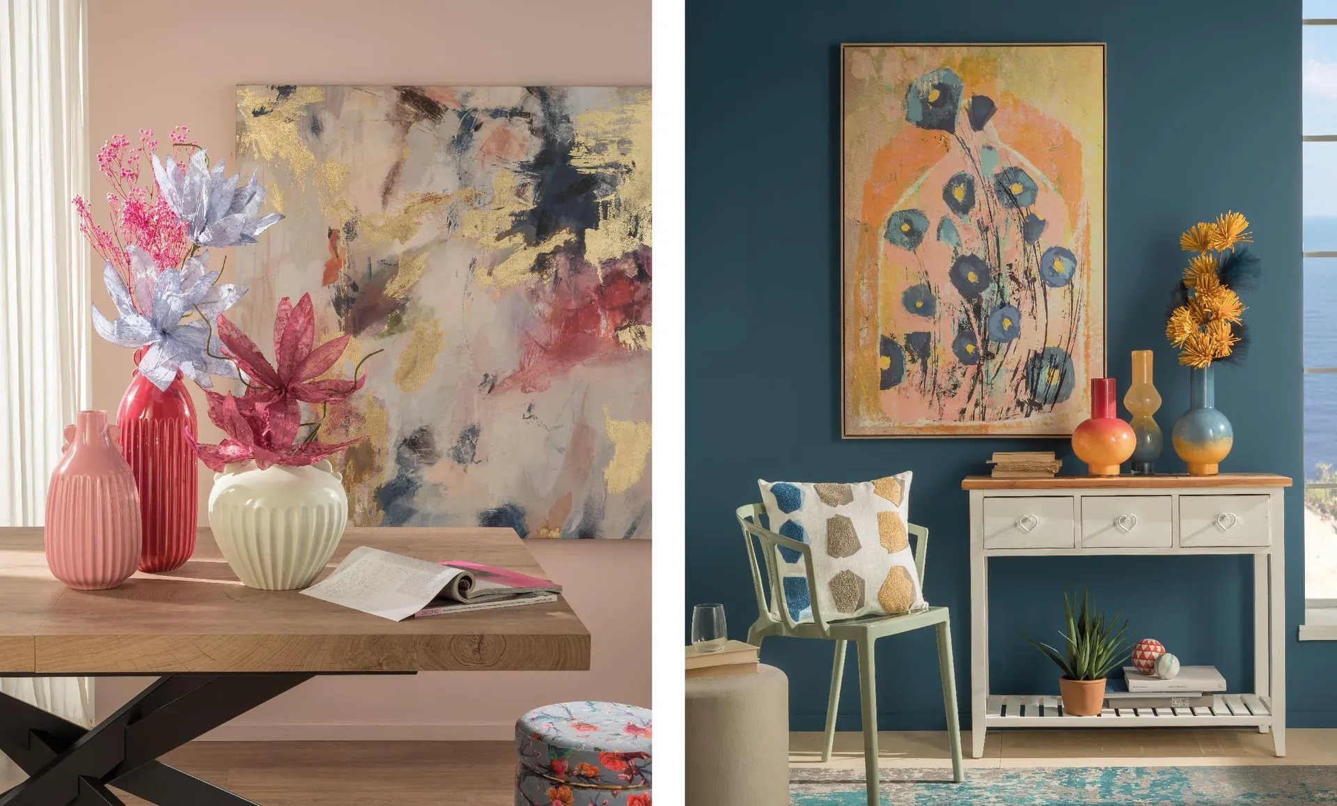Questi quadri non sono semplicemente elementi decorativi, ma veri e propri protagonisti dello spazio. Le sfumature pastello offrono una base calma e rilassante, mentre i contrasti audaci – magari con zampilli di corallo o accenti di turchese brillante – iniettano energia e dinamismo, aggiungendo profondità e personalità all’ambiente.