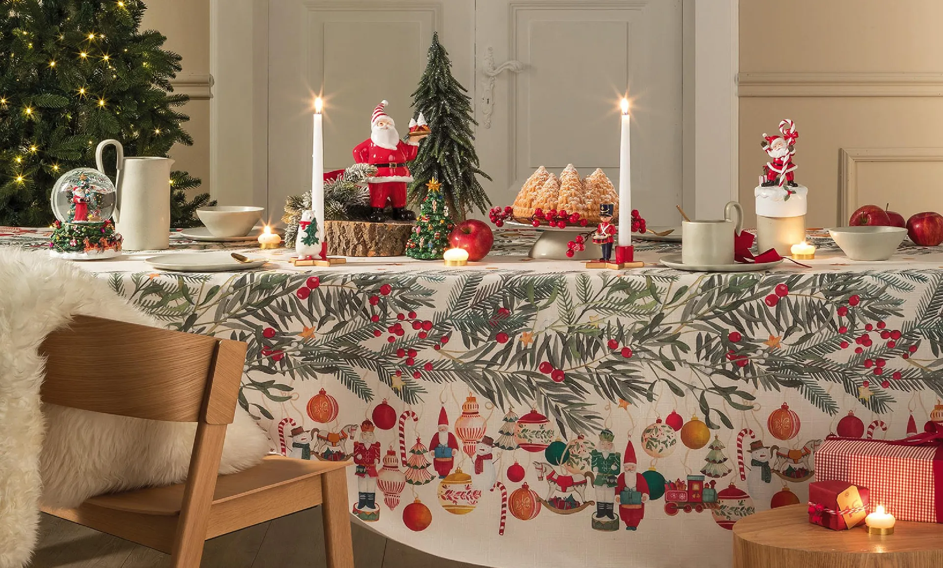 Intramontabile la tovaglia bianca decorata con motivi festivi: un tripudio di stelle, personaggi e oggetti natalizi che raccontano la magia di una festa in cui la tavola smette di essere oggetto e diventa luogo, famiglia, casa.