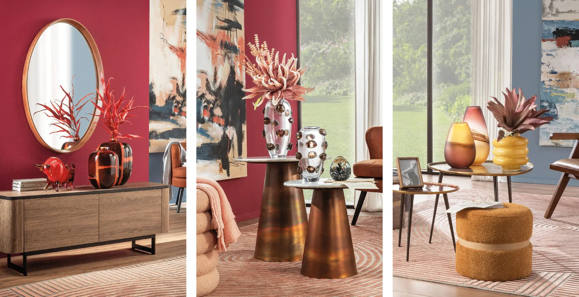 I vasi di questo stile non cercano mimetismo, ma affermazione: forme generose, scultoree, superfici riflettenti o satinate, colori pieni che vanno dal giallo miele al bordeaux profondo, dal vetro fumé al rame lucido.
