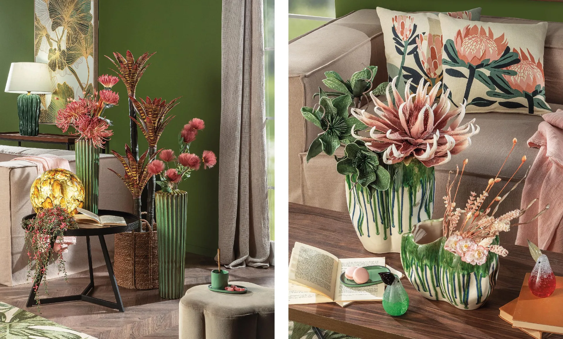 Da quelli in ceramica smaltata che sembrano appena scolpiti dalla linfa di una giungla tropicale, ai modelli alti e scanalati, in verde giada con finitura lucida, fino a quelli dalle linee verticali che ricordano bambù stilizzati fino alle colature verdi su fondo avorio, questi vasi da appartamento evocano la vegetazione lussureggiante con un linguaggio scultoreo. Ogni pezzo ha una forma autonoma, irregolare, che si fa presenza viva nell’ambiente.