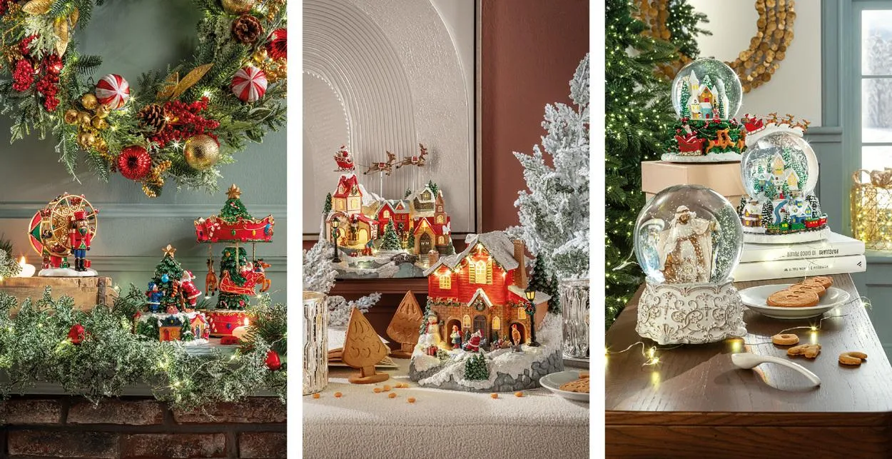 Mentre le decorazioni da appoggio aggiungono profondità e fascino a qualsiasi allestimento natalizio di vetrine. Piccoli villaggi illuminati, casette innevate e figure in movimento non solo abbelliscono la scena, ma creano un’atmosfera calda e accogliente, perfetta per raccontare una storia di festa, di tradizione, di felicità.